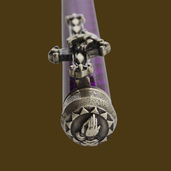 The defining feature of this pen is its cross-shaped clip, the central symbol of Christianity and the visual anchor of the design. Surrounding the cross are additional sacred elements that deepen its spiritual meaning. A dove represents the Holy Spirit, recalling the Baptism of Jesus when the Spirit descended in the form of a dove, as described in Scripture. Praying hands signify devotion, humility, and a life rooted in prayer, while the Bible represents God’s Word as the foundation of faith and truth. Candles, long associated with Christian worship, symbolize light, guidance, and the presence of God, reminding the faithful that Christ is the Light of the world.