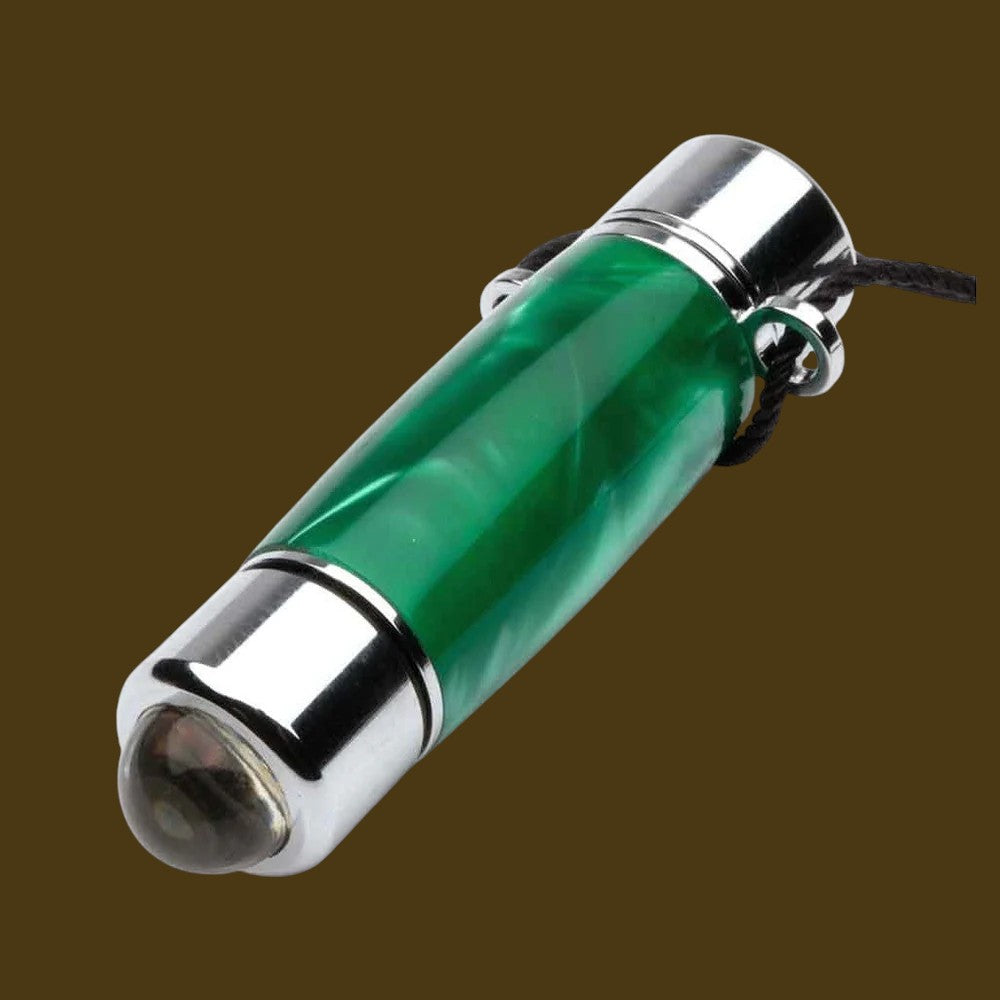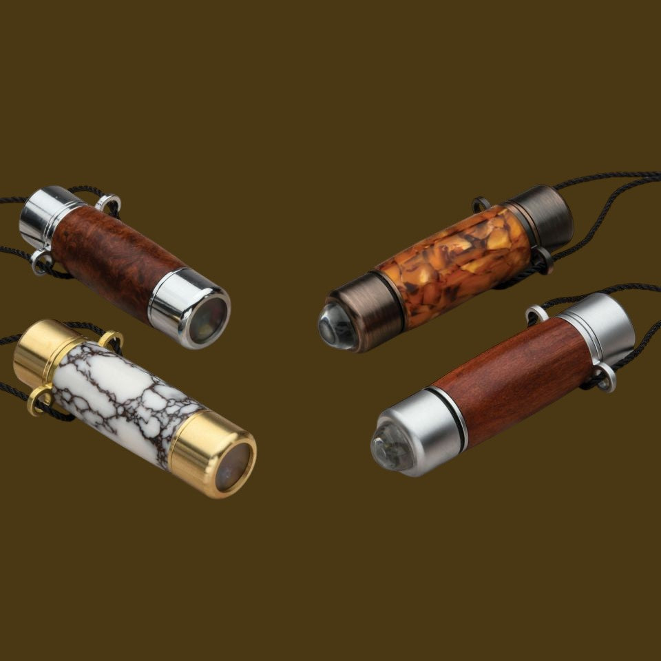 Each necklace features a precision optical interior housed within a hand-turned body, carefully shaped and polished to highlight the beauty and depth of the material. Unlike traditional kaleidoscopes that rely on internal beads, teleidoscopes create patterns by reflecting whatever you point them toward, turning everyday surroundings into living works of art.