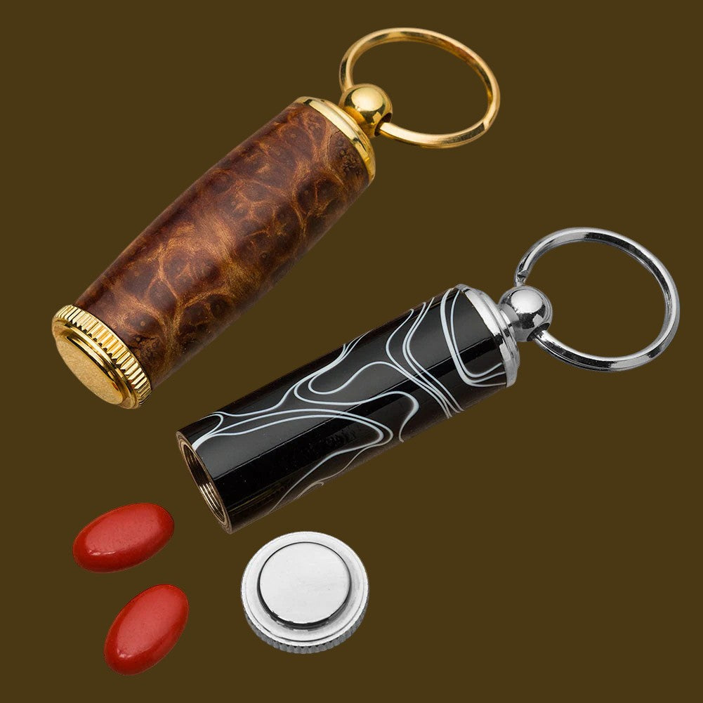 Each pill holder features a precision-machined metal capsule paired with a custom lathe-turned body made from distinctive materials such as richly figured wood or high-contrast resin patterns. Every piece is individually shaped and polished by hand, ensuring that no two pill holders are exactly alike.