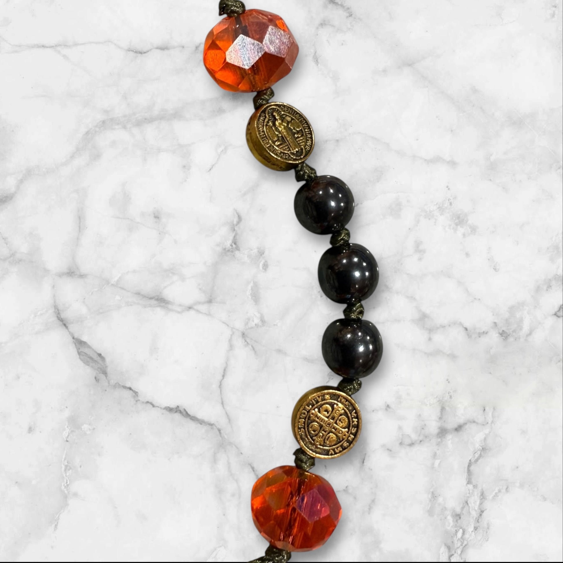 The hematite decade beads, with their dark metallic sheen, mirror the armored overlays and carbon-fused alloy surfaces of the Mark VI suit. Cold, reflective, and resilient, they symbolize the unwavering resolve and layered protection that define both a warrior’s armor and a believer’s faith.