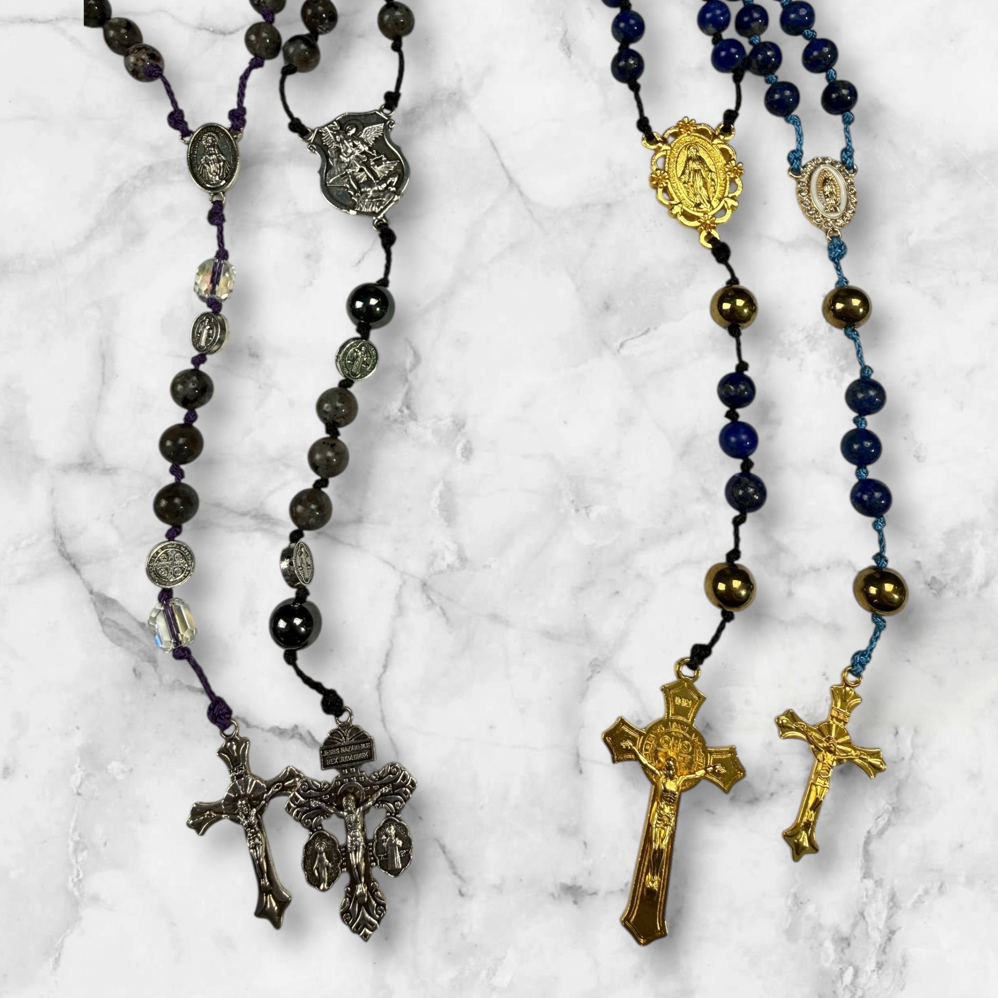 Each rosary in the pair is customized individually, allowing both partners to express their personal devotion while remaining united in prayer. You may choose from a wide variety of bead materials and bead sizes, from natural stone and glass to metals and specialty beads. Hardware can be selected to match your style, including durable paracord in various colors or traditional jewelry-style metal hardware in gold or silver tones.